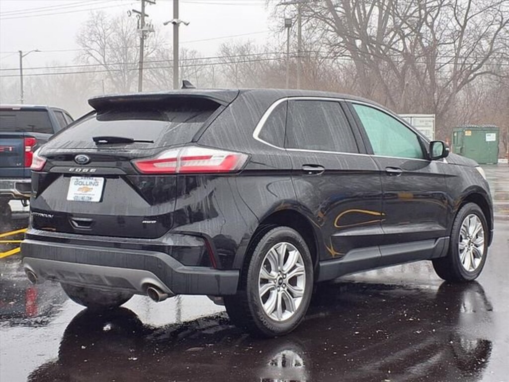 Beneath the sleek exterior, the Edge Titanium is powered by a potent EcoBoost 2.0L I4 GTDi DOHC Turbocharged VCT engine, delivering a thrilling 8-speed automatic transmission and all-wheel drive capabilities. With an EPA-estimated 21 mpg in the city and 28 mpg on the highway, this SUV offers exceptional fuel efficiency without sacrificing performance.